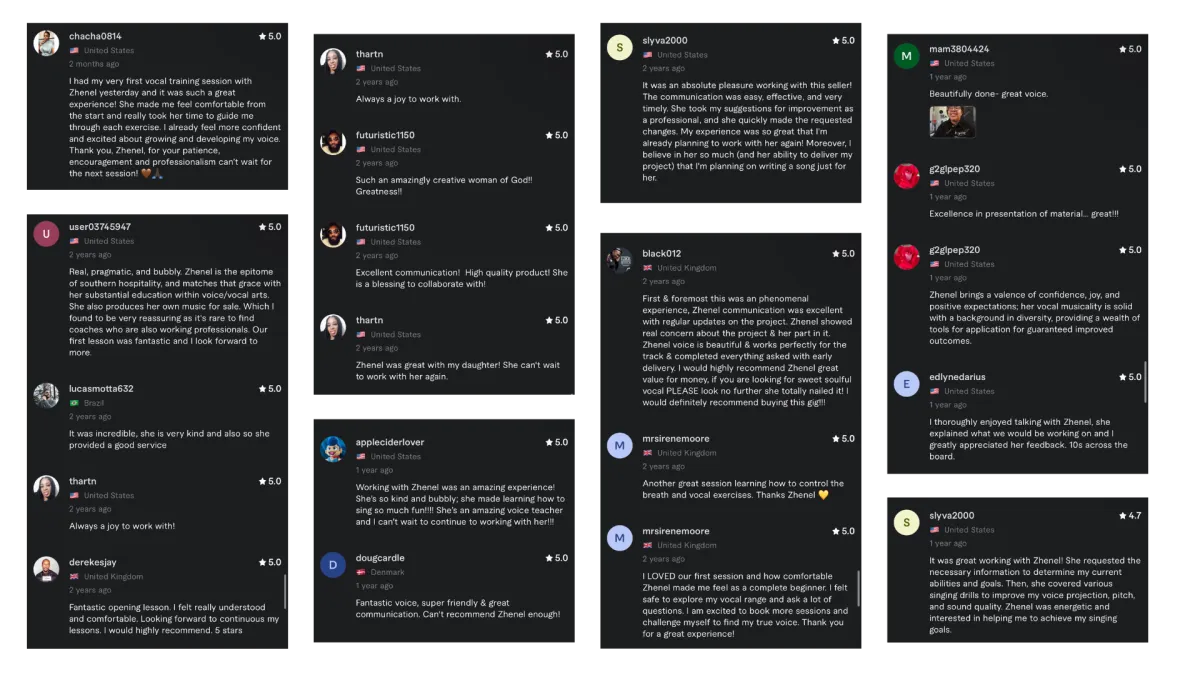 “I had my very first vocal training with Zhenel yesterday and it was such a great experience! She made me feel comfortable from the start and really took her time to guide me through each exercise. I already feel more confident and excited about growing and developing my voice.